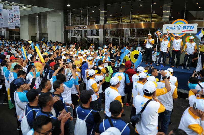 JAKARTA (Pos Sore.com)- Deputi Bidang Usaha Jasa Keuangan, Jasa Konstruksi dan Jasa Lainnya Kementerian BUMN, Gatot Trihargo (kiri) dan Direktur Utama PT Bank Tabungan Negara (Persero) Tbk. Maryono (kedua kiri) bersama Komisaris Utama Bank BTN I Wayan Agus Mertayasa (kedua kanan) dan Staf Khusus Menteri Badan Usaha Milik Negara (BUMN) Sahala Lumban Gaol (kanan) mengangkat bendera start tanda dimulainya charity funwalk yang diikuti oleh lebih dari 10.000 peserta dalam rangka perayaan Hari Ulang Tahun ke 69 Bank BTN, di JCC Senayan, Jakarta, Minggu (10/2). Pada usianya yang ke-69, Bank BTN berhasil membukukan aset sebesar lebih dari Rp 300 triliun dan berhasil menduduki peringkat ke lima bank terbesar dari sisi aset di Indonesia. Bank BTN yang fokus pada kredit perumahan mencatatkan kredit sekitar Rp 523triliun selama 69 tahun berdiri.Bambang Tri