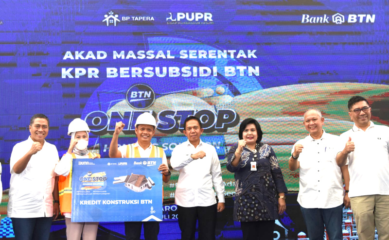 JAKARTA (Possore.com) -Direktur Consumer Bank BTN Hirwandi Gafar (kiri) bersama Direktur Jenderal Pembiayaan Infrastruktur Pekerjaan Umum dan Perumahan, Kementerian PUPR RI, Herry Trisaputra Zuna serta Deputi Komisioner Bidang Pemanfaatan Dana Tapera, BP Tapera Ariev Baginda Siregar dimulainya acara akad massal serentak KPR subsidi dalam rangkaian One Stop Housing Solution BTN di Maros, Sulawesi Selatan, Sabtu (23/7). Gelaran acara akad massal KPR Subsidi BTN yang diikuti oleh lebih dari 10.000 debitur di seluruh Indonesia merupakan strategi Bank BTN untuk mempercepat penyaluran KPR Subsidi (FLPP) yang ditargetkan dapat menembus 200.000 unit pada tahun 2022. B. Tri Prasetyo.
