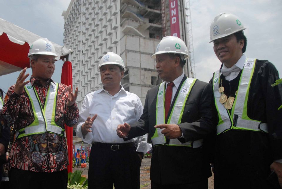 SEMARANG (Pos Sore)-Direktur Utama PT Bank Tabungan Negara (Persero) Tbk yang juga Ketua IKA Undip Maryono bersama dengan Menristek Mohamad Nasir (kedua kanan) , Rektor Undip Yos Johan (kanan) dan Direktur Utama PT PP Tumiyana (kiri) berbincang usai melakukan groundbreaking tower IKA Undip di kawasan Tembalang, Semarang Jawa Tengah, Selasa (17/10). BTN mulai gencar melakukan pembiayaan baik melalui kredit konstruksi maupun KPA untuk pembangunan apartemen dekat kampus.yang diperuntukkan bagi mahasiswa dan masyarakat umum. Setelah membiayai tower kampus UI, BTN mulai incar pembiayaan sekitar 2.000 unit apartemen tower Undip. Posisi Januari sd Agustus 2017 Bank BTN telah menyalurkan kredit konstruksi senilai Rp 9,04 triliun rupiah atau tumbuh 18,6% dibanding periode yang sama tahun lalu.(Bambang Tri)