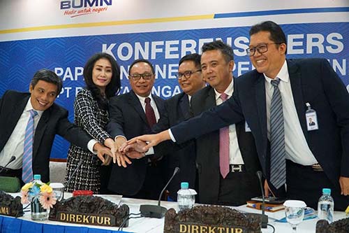 JAKARTA (Pos Sore)-Direktur Utama PT Bank Tabungan Negara (Persero) Tbk. Maryono bersama jajaran Direksi Bank BTN Nixon Napitupulu (kiri), Handayani, Iman Nugroho Soeko (ketiga kanan), Oni Febriarto, dan Mahelan Prabantarikso dalam Paparan Kinerja Bank BTN Kuartal II/2017 di Menara BTN, Jakarta, Senin (24/7). Pada paruh pertama tahun ini, laba bersih Bank BTN tercatat naik 21,95% secara tahunan (year-on-year/yoy) menjadi Rp1,27 triliun dan penyaluran kredit Bank BTN tumbuh 18,81% yoy menjadi Rp177,4 trilliun. Bank BTN tetap berkomitmen memberikan dukungan dalam program satu juta rumah dengan target tahun 2017 sebanyak 666.000 unit rumah. Per 30 Juni 2017 perseroan telah merealisasi lebih dari 50% atau sebanyak 370.173 unit rumah dengan nilai kredit mencapai Rp39,01 triliun. Bambang Tri P.