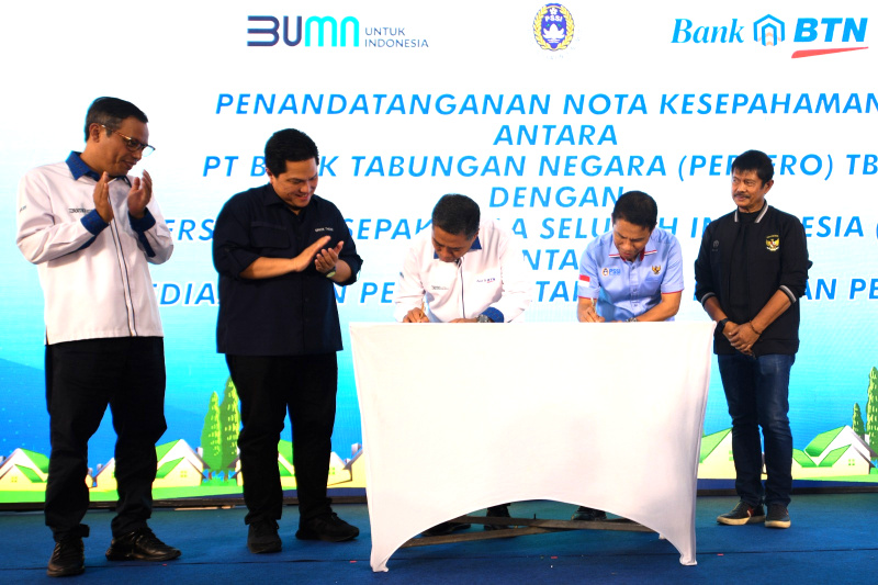 JAKARTA (Possore.id) -Menteri BUMN Erick Thohir dan Direktur Utama Bank BTN Nixon LP Napitupulu menyaksikan Direktur Consumer Bank BTN Hirwandi Gafar dan Sekjen PSSI Yunus Nusi melakukan Penandatanganan Nota Kesepahaman terkait kerjasama Penyediaan Jasa Layanan Perbankan di Sidoarjo, Sabtu (9/9/2023). Kolaborasi antara Bank BTN dan PSSI akan memberikan kemudahan bagi para pelaku olahraga sepakbola untuk bisa memiliki rumah impian yang terjangkau dan layak huni. Pada kesempatan yang sama Bank BTN memberikan persetujuan KPR kepada Indra Sjafrie yang merupakan Direktur Teknik PSSI.B.Tri Prasetyo.