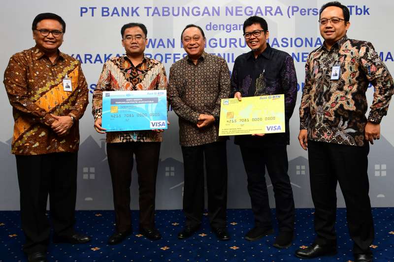 JAKARTA (Pos Sore.com)-PT Bank Tabungan Negara (Persero) Tbk menggandeng Dewan Pengurus Nasional Masyarakat Profesi Penilai Indonesia (DPN-MAPPI) dan Institut Akuntan Publik Indonesia (IAPI) dalam sinergi kerjasama konsultan. Kerjasama ini dimaksudkan untuk meningkatkan perbaikan kualitas penyaluran kredit dan pembiayaan serta perbaikan kualitas jaminan kredit Bank BTN. Direktur Utama Bank BTN Maryono (tengah) foto bersama usai menyaksikan penandatanganan kerjasana tersebut yang ditandatangani masing-masing oleh Direktur Bank BTN Iman Nugroho Soeko (kiri) dan Andi Nirwoto (kanan) Direktur Utama IAPI Tarko Sunaryo (kedua kiri) dan Direktur Utama DPN-MAPPI Okky Danuza (kedua kanan) di Jakarta, Senin (17/12). Bambang Tri P