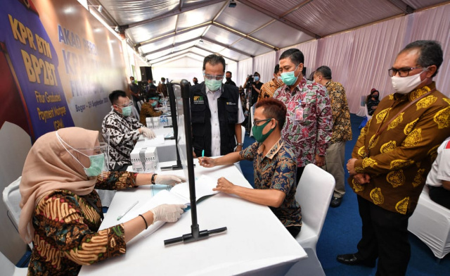BOGOR (Possore.com) -Direktur Consumer and Commercial Lending PT Bank Tabungan Negara (Persero) Tbk, Hirwandi Gafar bersama Dirjen Pembiayaan Infrastruktur Pekerjaan Umum dan Perumahan, Kementerian PUPR, Eko D. Heripoerwanto ( kanan) dan Kepala Kantor Wilayah I Bank BTN Manahan Hutapea (kiri) meninjau proses akad perdana KPR Bantuan Pembiayaan Perumahan Berbasis Tabungan (BP2BT) dengan fitur Graduated Payment Mortgage (GPM) di Perumahan Pesona Kahuripan 3, Cileungsi Bogor, Jawa Barat, Selasa (29/9). Sejak diluncurkan Bank BTN pada tanggal 7 September 2020, KPR BP2BT fitur GPM makin diminati masyarakat, tercatat hingga akhir September ini sudah mencapai sekitar 200 debitur yang mengajukan aplikasi KPR Subsidi BP2BT dengan fitur GPM dan telah melakukan akad kredit pada bulan yang sama. B. Tri Prasetyo