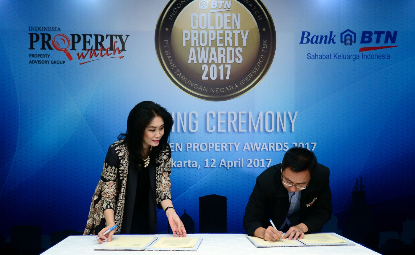 Jakarta (Possore)-Direktur Bank BTN Handayani (kiri) dan Direktur Eksekutif Indonesia Property Watch Ali Tranghanda (kanan) melakukan penandatanganan perjanjian kerjasama terkait BTN Golden Property Awards 2017 di Jakarta, Rabu (12/4/2017). Dengan adanya kerjasama ini BTN dan IPW akan mengelar BTN GPA 2017 untuk mengapresiasi para pengembang, termasuk mereka yang berhasil melewati masa terendah di industri properti pada 2016 sekaligus untuk mendorong pertumbuhan bisnis properti di Indonesia.Bambang Tri P