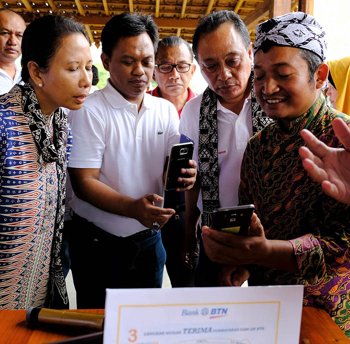 MAGELANG (Pos Sore)-Direktur Utama PT Bank Tabungan Negara (Persero) Tbk Maryono didampingi Kepala Divisi Digital Banking Dopo Lastiyomo (tengah) bersama Menteri BUMN Rini Soemarno menyaksikan penggunaan aplikasi Quick Response Payment untuk membeli gerabah dari pengrajin di Balkondes Karanganyar, Magelang, Jawa Tengah, Minggu (20/8 /2017). Bank BTN meluncurkan aplikasi transaksi Quick Response Payment (QR Payment). Aplikasi ini memudahkan pembeli dan penjual bertransaksi tanpa menggunakan mesin Electronic Data Capture/ EDC cukup dengan memindai kode QR yang terpampang pada layar aplikasi. Aplikasi tersebut bisa menghemat biaya sewa/ beli EDC Bank BTN hinggga jutaan rupiah per bulan.Bambang Tri P.