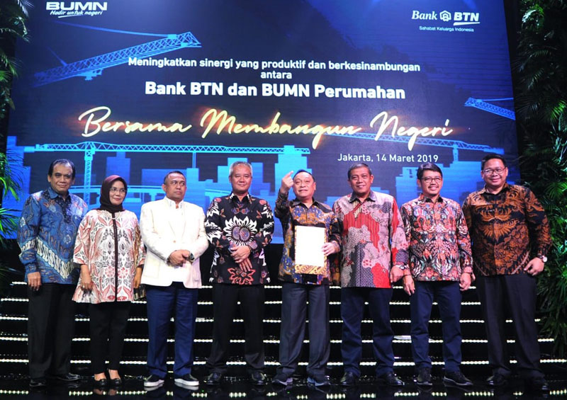 JAKARTA (Pos Sore.com)– Direktur Utama PT Bank Tabunga Negara (Persero) Tbk. Maryono (tengah) bersama Direktur Utama PT Wijaya Karya (Persero) Tbk. Tumiyana (kedua dari kiri) , Direktur Utama PT Pembangunan Perumahan (Persero) Tbk. Lukman Hidayat (kiri) , Direktur Keuangan PT Adhi Karya (Persero) Tbk Entus Asnawi (kedua dari kanan) , Direktur Keuangan dan Strategi PT Waskita Karya (Persero), Haris Gunawan (kanan) usai menandatangani komitmen bersama untuk bersinergi positif dan berkesinambungan dalam pembiayaan dan perumahan, di Jakarta, Kamis (14/3/2019) Malam. Bank BTN merangkul stakeholder BUMN yang bergerak di bidang perumahan untuk saling bekerjasama guna menurunkan angka backlog perumahan di Indonesia. Bank BTN juga telah berhasil menyalurkan kredit dan pembiayaan sebesar Rp. 237,76 Triliun dimana selama 5 tahun terakhir pertumbuhan rata-rata penyaluran kredit dan pembiayaan di sektor perumahan adalah sebesar 20,04%. Bambang Tri P
