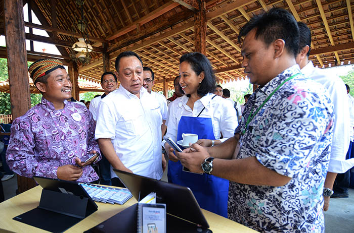 MAGELANG (Pos Sore) — Direktur Utama PT Bank Tabungan Negara (Persero) Tbk Maryono bersama Menteri BUMN Rini M Soemarno menyaksikan penggunaan aplikasi Quick Response Payment untuk membeli gerabah dari pengrajin di Balkondes Karanganyar, Magelang, Jawa Tengah, Minggu (18/9).