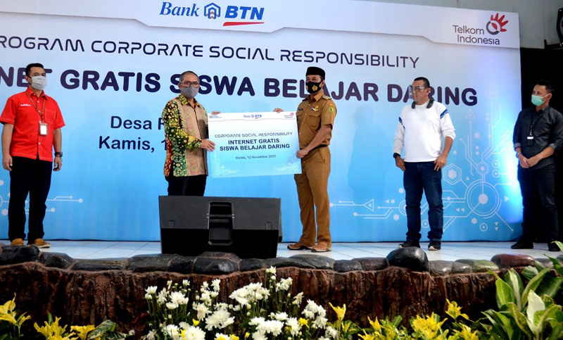 JAKARTA(Possore.com) -Dari kiri ke kanan : Kepala Kantor Wilayah 1 Bank BTN Manahan Hutapea, Operasional Senior Manager Marketing Telkom Regional 3 Jawa Barat Hendrawan, Kepala Desa Rancaekek Tata Darta, Staff Khusus III KBUMN Arya Sinulingga, Corporate Secretary BTN Ari Kurniaman dan Kepala Cabang BTN Bandung Bambang Prasetyo berfoto bersama usai penyerahan bantuan internet gratis siswa belajar daring yang di gagas oleh Bank BTN dengan Telkom, di Rancaekek, Bandung, Kamis (12/11). Internet gratis tersebut merupakan kegiatan CSR Bank BTN bekerjasama dengan Telkom untuk mendukung program pemerintah terkait dengan proses belajar siswa secara daring yang diberikan kepada 30 desa di wilayah jawa barat. Kegiatan ini sebagai pilot project yang akan dilaksanakan oleh Bank BTN ke kantor wilayah di seluruh Indonesia. B.Tri Prasetyo