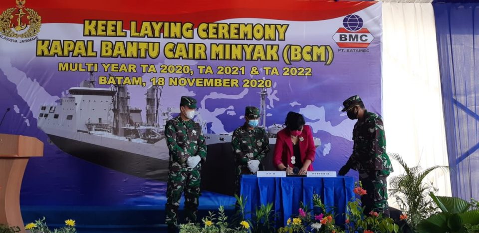 Peletakan lunas/Keel Laying dan pernyataan resmi pembangunan Kapal BCM dengan prosesi penekanan tombol sirine oleh Asintel Kasal Laksamana Muda TNI Angkasa Dipua, di Galangan Kapal PT Batamec Shipyard, Tanjung Uncang, Batam Kepri, dilakukan pada Rabu (18/11/2020).