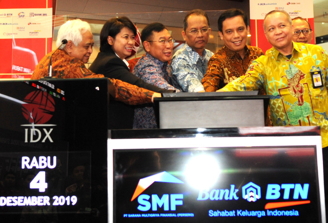 1. JAKARTA (PosSore.com) – Direktur Finance, Planning & Treasury  PT Bank Tabungan Negara (Persero) Tbk  Nixon LP Napitupulu  (kedua dari kanan) dan  Direktur Utama PT SMF  Ananta Wiyogo (ketiga dari kiri) bersama dengan  Direktur Pelaksanaan Pembiayaan Perumahan Kementerian PUPR Adang Sutara,  Senior EVP Direktorat Treasury And Global Services Bank BRI Listiarini Dewajanti dan  Direktur Pengelolaan Investasi OJK, Halim Haryono serta Komisaris Utama SMF Iskandar Saleh meresmikan pencatatan EBA- SP SMF BTN 05 di Bursa Efek Indonesia, Jakarta Rabu (4/12/2019). Adapun nilai total EBA-SP sebagai instrumen hasil sekuritisasi dan tagihan KPR yang diperdagangkan senilai Rp 2 Triliun. Dengan tercatatnya EBA-SP SMF BTN 05 yang meraih rating id AAA dan sangat diminati pasar tersebut, maka Bank BTN telah tercatat 12 kali melakukan transaksi sekuritisasi dengan total nilai EBA mencapai sebesar Rp 11,65 triliun. B. Tri Prasetyo