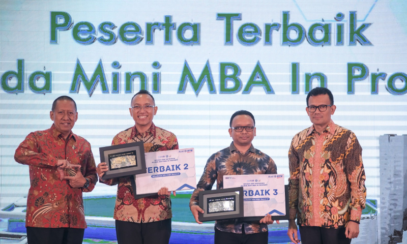 JAKARTA (Possore.id) -Direktur Finance PT Bank Tabungan Negara (Persero) Tbk Nofry Rony Poetra bersama Dekan School of Business and Management Institut Teknologi Bandung (SBM ITB) Prof Ignatius Pulung Nurprasetio secara simbolis memberikan penghargaan kepada para wisudawan dalam acara Wisuda Mini MBA in Property batch 16-19 di Jakarta, Sabtu (27/1/2024). Saat ini lulusan Mini MBA in Property telah mencapai sekitar 1.000 orang yang diharapkan mampu menjadi developer handal, sehingga kedepannya dapat ikut berkontribusi dalam mengurangi backlog perumahan yang mencapai 12,7 juta rumah. B. Tri Prasetyo