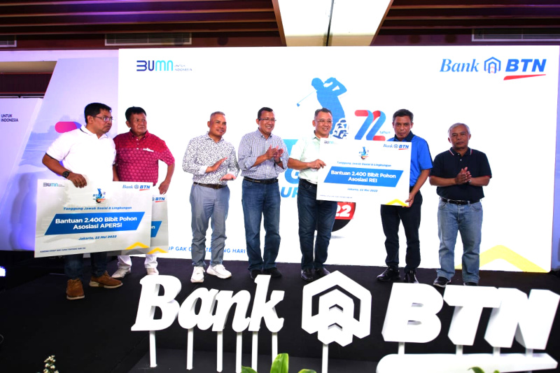 JAKARTA (Possore.com) –Direktur Utama Bank BTN Haru Koesmahargyo (kedua kanan) bersama Dirjen Pembiayaan Infrastruktur Pekerjaan Umum dan Perumahan Kementerian PUPR sekaligus Komisaris Bank BTN Herry Trisaputra Zuna, (kiri) Anggota Komisi XI DPR RI Ahmad Hafisz Tohir (kedua kiri) dan Wakil Ketua Dewan Komisioner OJK Terpilih Mirza Adityaswara melakukan Tea Off pada acara BTN Golf Tournament 2022 di Jakarta, Minggu (22/05). BTN Tournament Golf 2022 merupakan rangkaian acara HUT ke 72 Tahun Bank BTN dengan mengundang stakeholder dan mitra perseroan untuk mempererat sinergi serta kolaborasi dalam menyukseskan program sejuta rumah. Pada acara tersebut Bank BTN memberikan bantuan Tanggung Jawab Sosial dan Lingkungan (TJSL) kepada para pengembang berupa 7.200 bibit pohon yang dibagi pro rata kepada REI, Apersi dan Himpera masing-masing 2.400 bibit pohon untuk mendukung program perumahan ramah lingkungan yang menjadi fokus BTN.B.Tri Prasetyo.