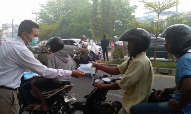JAMBI (Pos Sore.com) – Karyawan PT Bank Tabungan Negara (Persero) Tbk. Kantor Cabang Jambi membagikan masker bagi masyarakat Jambi dan sekitarnya, di Jambi, Kamis (19/9/2019). Selain di Jambi, karyawan Kantor Cabang Pembantu di Muara Bungo juga menggelar aksi serupa. Aksi Bank BTN berbagi masker tersebut dilakukan sebagai langkah proaktif melihat kondisi udara di wilayah Jambi dan sekitarnya yang sudah parah. Aksi berbagi ini juga sebagai wujud BUMN Hadir Untuk Negeri. B.Tri Prasetyo