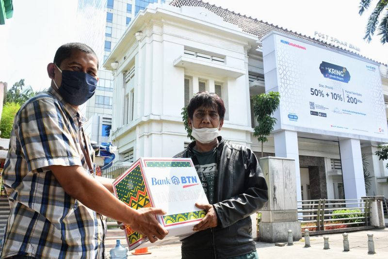 JAKARTA (Possore.com)- PT Bank Tabungan Negara (Persero) Tbk berbagi sembako kepada para tukang ojek pangkalan yang mangkal di sekitar Kantor Pusat Bank BTN Jl. Gajah Mada Jakarta pada Minggu (17/5/2020). Tampak salah seorang pegawai BTN membagikan sembako tersebut pada tukang ojek yang sudah berlangganan sejak lama untuk antar jemput pegawai BTN yang bertugas selama ini. Termasuk tukang ojek tersebut, BTN turut peduli dan berbagi dalam membantu masyarakat terdampak Covid-19 dimana setidaknya sudah hampir mencapai Rp4 Milyar BTN telah menyalurkan dalam bentuk sembako dan alat kesehatan di seluruh Indonesia.B.Tri Prasetyo.