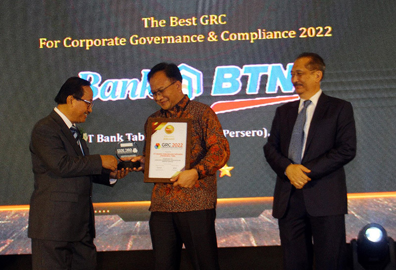 JAKARTA(Possore.com) -Compliance & Governance Division Head PT Bank Tabungan Negara (Persero) Tbk (BTN) R. Wahyu B. Witjaksono (tengah) mewakili Direktur Human Capital, Compliance & Legal Bank BTN, Eko Waluyo menerima penghargaan sebagai The Best Chief Compliance Officer (Banking Services) dan The Best GRC for Corporate Governance & Compliance 2022 5 Stars pada ajang GRC & Performance Excellence Award 2022 di Jakarta, Rabu (27/7). Penghargaan tersebut merupakan apresiasi atas penerapan Good Corporate Governance (GCG) Bank BTN yang telah menerapkan Tata kelola yang baik melalui Governance System yang terdiri dari Commitment on Governance; Governance Structure, Process dan Outcome. B.Tri Prasetyo