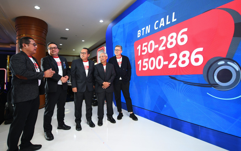 JAKARTA (Possore.id)-SEVP Operations PT Bank Tabungan Negara (Persero), Alex Sofjan Noor (kiri), Direktur IT & Digital, Andi Nirwoto (kedua dari kiri), Direktur Human Capital, Compliance & Legal, Eko Waluyo (tengah), Direktur Distribution &Funding, Jasmin (kedua dari kanan) , Direktur Institutional Banking, Hakim Putratama (kanan) menunjuk layar bertuliskan “150286 dan 1500286” saat meluncurkan nomor baru BTN Call di Jakarta, Rabu (3/5/2023). Bank BTN menambah nomor BTN Call 150286 untuk meningkatkan layanan kepada nasabah sekaligus meningkatkan efisiensi operasional BTN Call agar dapat melayani dan menangani pertanyaan dan keluhan nasabah secara cepat dan efektif serta mendukung bisnis melalui telesales.B.Tri Prasetyo