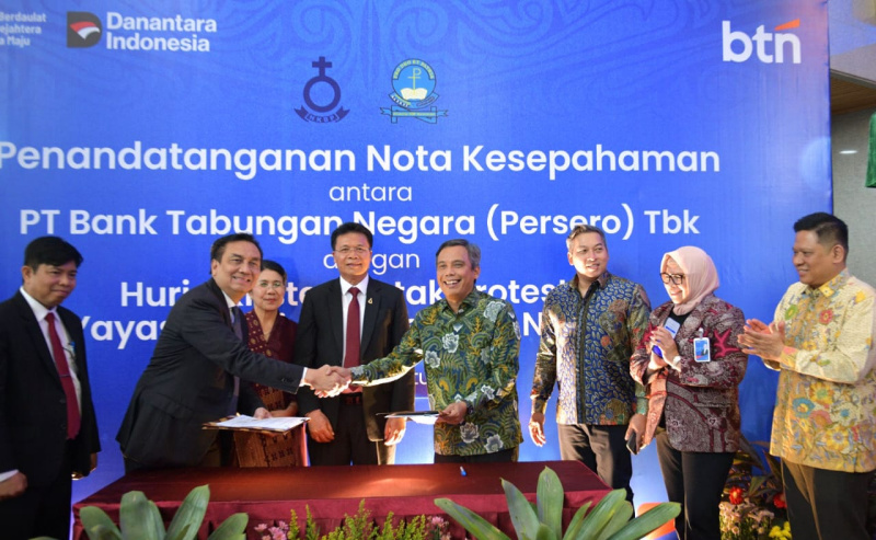JAKARTA (Possore.id) -Direktur Utama BTN Nixon LP Napitupulu bersama Ketua Yayasan Universitas HKBP Nomensen, Dr. Effendi Muara Sakti Simbolon memperlihatkan naskah MOU disaksikan Ompui Ephorus HKBP , Pdt. Dr. Victor Tinambunan, MST, Direktur Network & Retail Funding BTN Rully Setiawan, Direktur Commercial Banking BTN Hermita dan SEVP Digital Business BTN Thomas Wahyudi usai menandatangani Nota Kesepahaman (MOU) antara BTN dengan Huria Kristen Bataka Protestan (HKBP) dan Yayasan Universitas HKBP Nomensen di Medan, Sumater Utara, Selasa (26/8/2025). Penandatangan MOU dilakukan dalam rangka kerja sama penyediaan layanan perbankan bagi 6,5 juta jemaat HKBP. Dengan kerja sama tersebut memungkinkan BTN untuk menyediakan produk dan solusi komprehensif untuk HKBP dari sisi pendanaan hingga pembiayaan. BTN akan menyediakan produk Tabungan Khusus untuk jemaat HKBP sehingga menjadi bentuk nyata sinergi antara ibadah, tabungan, dan dukungan pada gereja. Dukungan terhadap HKBP sebagai organisasi yaitu melalui solusi pengelolaan dana gereja melalui Bale Korpora, yaitu platform digital korporasi BTN dengan Single Sign-On. Nixon mengatakan, Bale Korpora dapat membantu gereja untuk melakukan transfer dana, pembayaran atau pembelian, payroll, hingga manajemen likuiditas, sehingga gereja dapat mengelola keuangannya secara transparan, efisien, dan profesional. B. Tri Prasetyo.