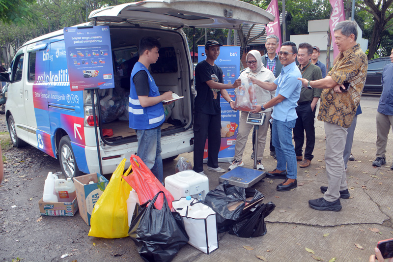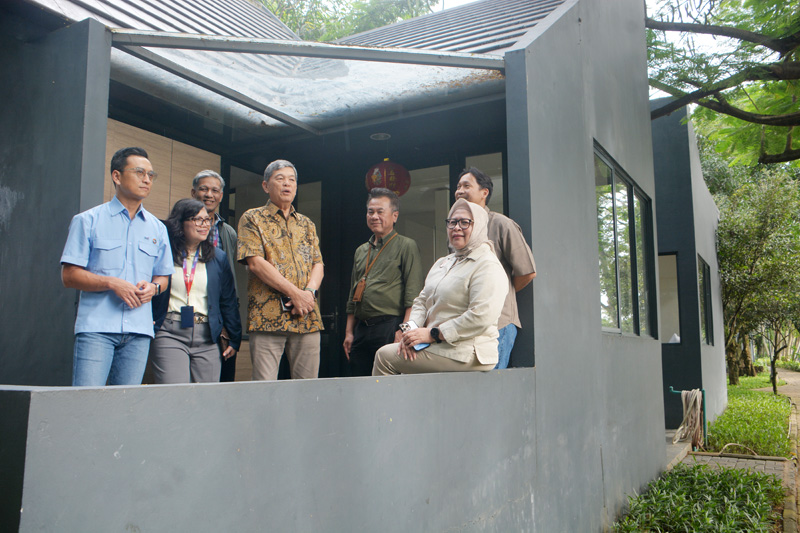 (kedua kanan) berbincang di salah satu rumah rendah emisi yang dibiayai BTN di Mutiara Gading City, Bekasi, Rabu (4/2/2026). Hingga akhir 2025, BTN telah menyalurkan pembiayaan untuk pembangunan 11.000 rumah rendah emisi dari berbagai developer di berbagai daerah, contohnya Legok, Cileungsi, Medan, Semarang, Cirebon, dan Bekasi. Tahun ini perseroan menargetkan membiayai 20.000 unit rumah rendah emisi. Sampai tahun 2030, BTN membidik akan membiayai 200.000 unit karena rumah merupakan salah satu penyumbang terbesar emisi.B.Tri Prasetyo.