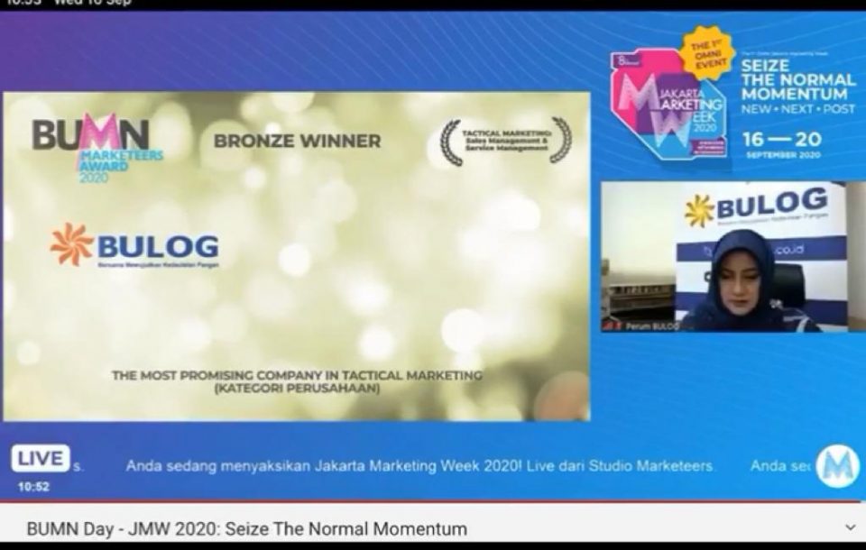 POSSORE — Jajaran BULOG memang patut sumringah, karena pekan ini perusahaan plat merah itu mraih 4 penghargaan sekaligus di ajang BUMN Marketeers Award 2020 yang diselenggarakan oleh BUMN Marketeers di Jakarta. Penghargaan tersebut diterima oleh Kepala Divisi Komunikasi Pemasaran Perum BULOG, Siti Kuwati, melalui aplikasi Zoom yang dilakukan secara virtual, Rabu (16/9).