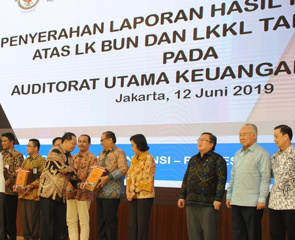 Penyerahan LHP laporan keuangan Kementerian/Lembaga dilakukan anggota II BPK, Agus Joko Pramono, Rabu (12/6). Acara tersebut juga dihadiri Menteri Keuangan Sri Mulyani, Menteri Perdagangan Enggartiasto Lukita, Menteri Perencanaan Pembangunan Nasional/Ketua Bappenas Bambang Brodjonegoro, Kepala BPKM Thomas Lembong dan sejumlah pimpinan lembaga lainnya.