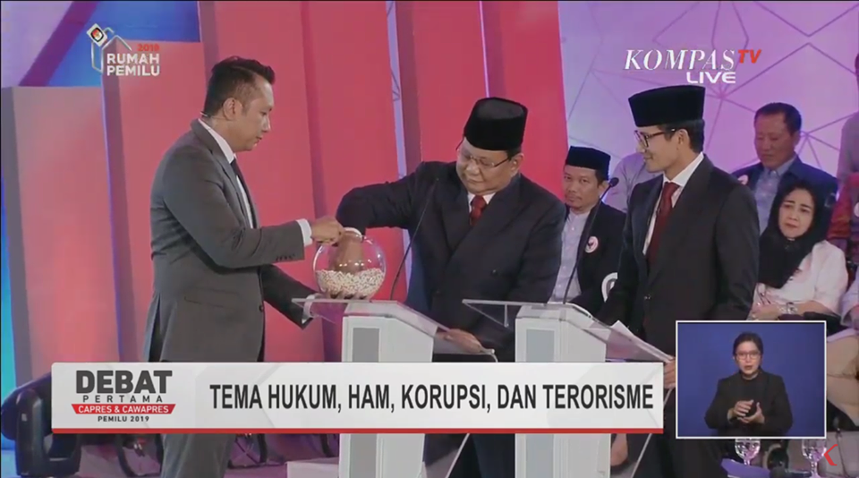 Debat perdana Capres diikuti kedua pasangan, Joko Widodo – Maruf Amin dan Prabowo Subianto — Sandiaga Uno yang digelar di panggung debat Hotel Bidakara, Jakarta. Debat ini dimoderatori Ira Kusno dan Imam Priyono, dua host televisi yang sudah berpengalaman. Debat terasa berjalan datar, tidak ada saling serang kecuali hanya sekali sekali petahana menyentil lawannya, seperti menyinggung kasus hoax Ratna Sarumpaet dan Caleg mantan koruptor yang dicalonkan partai Gerindra