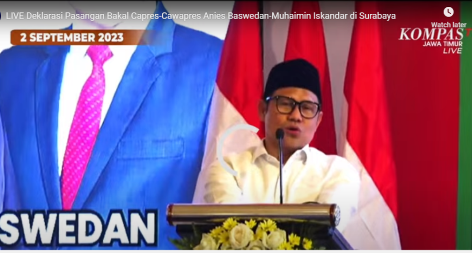 Ketua Umum PKB Muhaimin Iskandar berpidato usai deklarasi bakal calon presiden dan calon wakil presiden di Hotel Majapahit, Surabaya, Sabtu (2/9). //Tangkapan Layar Kompas