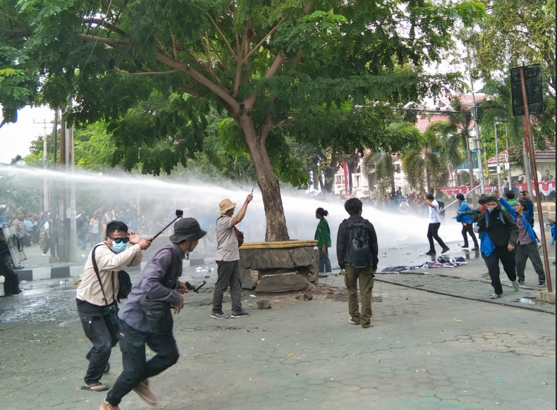 Aparat kepolisian menembakkan water cannon kepada ribuan massa aksi.