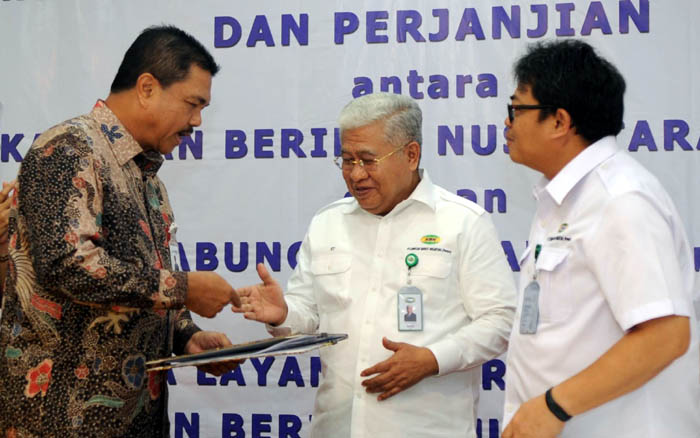 JAKARTA (Pos Sore.com) – Direktur PT Bank Tabungan Negara (Persero)Tbk Budi Satria (kiri) menjabat tangan Direktur Keuangan PT Kawasan Berikat Nusantara (PT KBN) Daly Mulyana (kanan) disaksikan Direktur Utama PT KBN HM Sattar Taba usai menandatangani Nota Kesepahaman Kerjasama mengenai penyediaan jasa dan layanan perbankan untuk karyawan PT KBN, di Jakarta, Senin (8/4/2019). Dalam kerjasama ini Bank BTN mengincar potensi penyaluran KPR baru dari karyawan PT KBN sekitar Rp 50 miliar. Sinergi Bank BTN dengan BUMN terus dilakukan untuk mendukung pencapaian program satu juta rumah yang tahun ini ditargetkan mencapai 800.000 unit. Bambang Tri