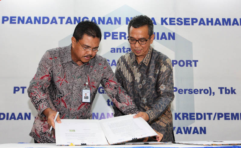 Direktur PT Bank Tabungan Negara (Persero)Tbk Budi Satria (kiri) bersama Direktur Utama PT Angkasa Pura Support (Persero), Iwan Hartawan (kanan)