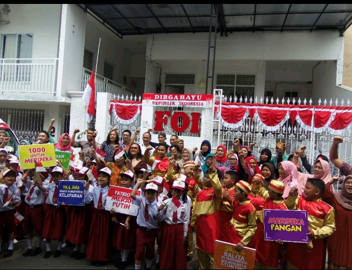 Untuk mencapai tujuan mulia ini, FOI pun berkomitmen memberantas kelaparan melalui ‘Deklarasi Menuju Indonesia Merdeka 100%’, di Kantor Pusat FOI, Jakarta, Kamis (16/8). Pembacaan deklarasi ini diikuti oleh donatur, dan koordinator relawan wilayah Jabodetabek.