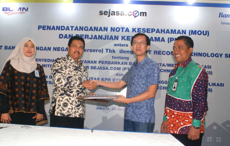 JAKARTA (Pos Sore.com) -Direktur PT Bank Tabungan Negara (Persero) Tbk. Budi Satria bertukar naskah dengan Country Director PT. Recomn Technology Services (Sejasa.com), Anthony Eka Wijaya disaksikan Kepala Divisi Digital Channel Bank BTN R. Meta Sutriatin (kiri) dan Kepala Divisi KPR Subsidi Bank BTN , Hirwandi Gafar (kanan) usai menandatangani Nota Kesepahaman mengenai penyediaan fasilitas KPR BTN Mikro kepada mitra atau anggota Sejasa.com di Jakarta, Selasa (29/1).