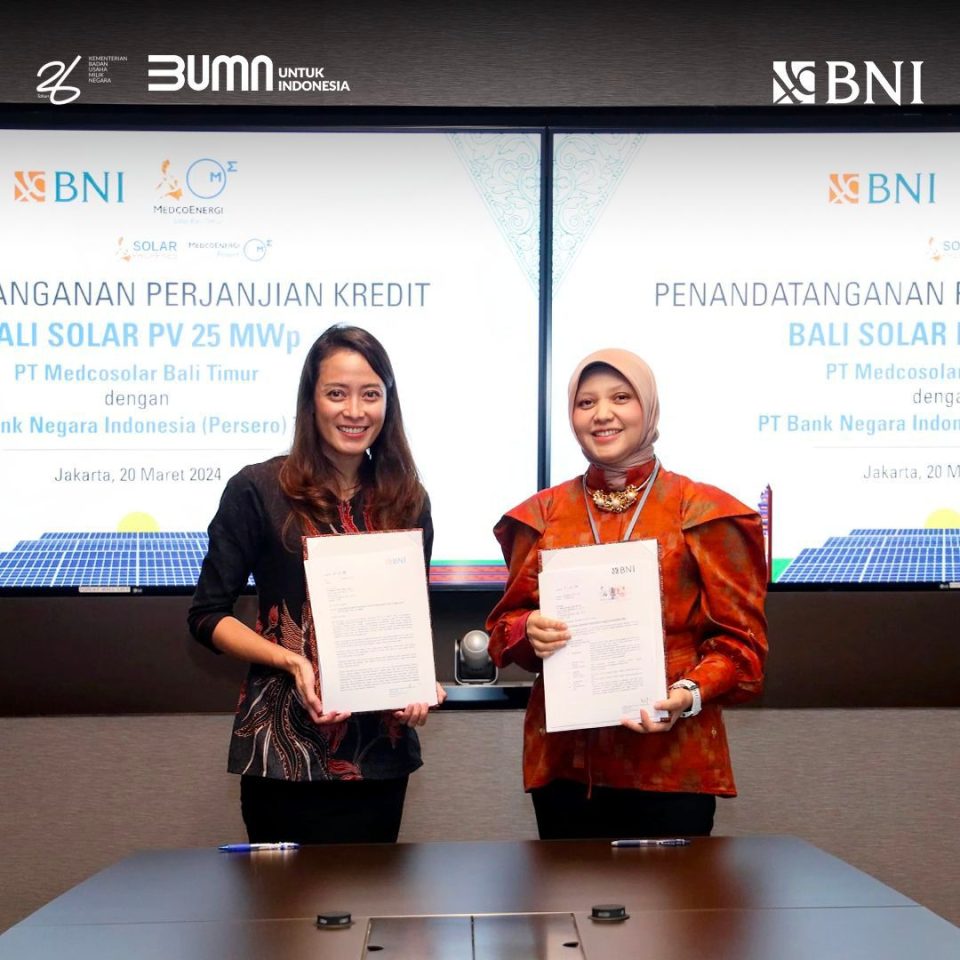 Penandatanganan Perjanjian Kredit dilakukan oleh Senior Vice President Corporate Banking 2 BNI Ditya Maharhani Harninda dan Direktur PT Medcosolar Bali Timur Myrta Sri Utami di Kantor PT Medco Power Indonesia, Jakarta, pada Rabu (20/3/2024).
