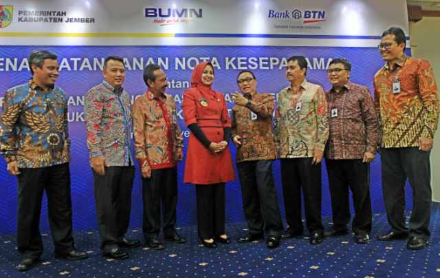 JAKARTA (Pos Sore)-Direktur Utama PT Bank Tabungan Negara (Persero) Tbk. Maryono (kedua kanan), Bupati Jember Faida (tengah), bersama jajaran Direksi Bank BTN Oni Febriarto, Adi Setianto, dan Budi Satria usai acara Penandatanganan Memorandum of Understanding (MoU) di Jakarta, Selasa (14/11). Bank BTN berencana membangun Kampung Nelayan Puger dengan dukungan Pemkab Jember dalam rangka menyukseskan Program Satu Juta Rumah. Melalui kemitraan tersebut, emiten bersandi saham BBTN ini juga akan menyediakan berbagai jasa dan layanan perbankan bagi Pemkab Jember termasuk melakukan kerja sama di bidang e-retribusi. Adapun, hingga Oktober 2017, perseroan telah merealisasikan 75,32% dari target penyaluran kredit perumahan dalam rangka Program Satu Juta Rumah.(Bambang Tri P)