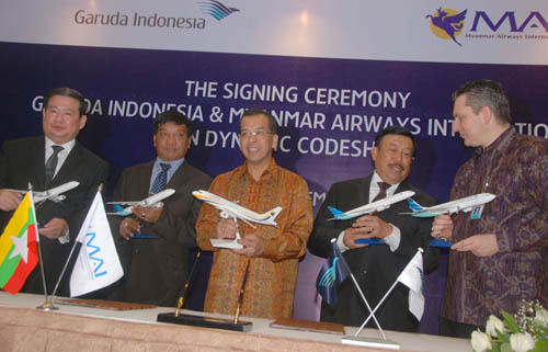 JAKARTA (Pos Sore) – Direktur Utama Garuda Indonesia Emirsyah Satar (tengah) bersama Manajer Myanmar Airways International Si Thu (kiri), Duta Besar Myanmar untuk Indonesia Indonesia San Myint Oo (kedua kiri), Duta Besar Indonesia untuk Myanmar Ito Sumardi (kedua kanan) dan Direktur Pemasaran dan Penjualan Garuda Indonesia Erik Meijer (kanan) menunjukkan replika pesawat Garuda Indonesia dan pesawat Myanmar usai menandatangani kerja sama “Code Share” di Garuda City Center, Tangerang, Banten, Selasa (25/11). “Code share” merupakan kerja sama kedua maskapai tersebut untuk memudahkan pengguna jasa dalam penerbangan tujuan Myanmar -Indonesia atau sebaliknya melalui Singapura dan Bangkok.(Bambang Tri P).