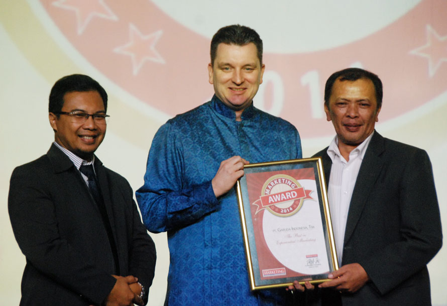 JAKARTA (Pos Sore) PT Garuda Indonesia (Persero) Tbk meraih dua penghargaan Marketing Award 2014 kategori The Best Innovation in Marketing dan The Best in Experiential Marketing.Penghargaan di terima EVP Sales Marketing Garuda Indonesia Erik Meijer (tengah) dari Dewan juri Wahyu Setyobudi dan Toni Sitinjak di Jakarta.Rabu (30/10/2014).(Bambang Tri P).