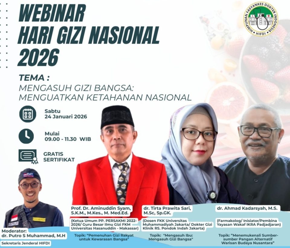 POSSORE.ID, Jakarta – Himpunan Fasyankes Dokter Indonesia (HIFDI) menggelar Webinar bertema Mengasuh Gizi Bangsa: Menguatkan Ketahanan Nasional, Sabtu (24/01/2026). Webinar ini dalam rangka memperingati Hari Gizi Nasional 2026 yang diperingati pada 25 Januari 2026.
