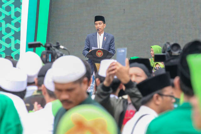 JAKARTA (Pos Sore.com) -Presiden Joko Widodo menghadiri Harlah ke-73 Muslimat Nahdlatul Ulama (NU), doa bersama untuk keselamatan bangsa dan maulidrrasul di Stadion Utama Gelora Bung Karno, Jakarta, Minggu (27/1/2019). Kegiatan yang diikuti ribuan peserta dari berbagai daerah tersebut mengangkat tema ”Khidmah Muslimat NU, Jaga Aswaja, Teguhkan Bangsa. Bambang TriĀ