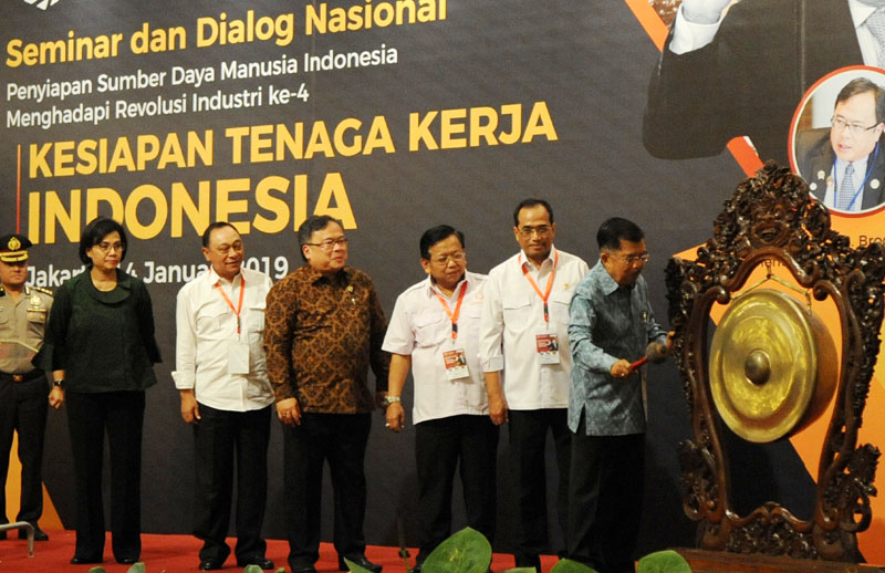 JAKARTA (Pos Sore.com)– Wakil Presiden RI, Jusuf Kalla (kanan) membuka seminar dan dialog bertajuk “Penyiapan SDM Indonesia menghadapi Revolusi Industri ke-4” disaksikan Menteri Keuangan, Sri Mulyani (kiri), Ketua IKA Undip yang sekaligus Direktur Utama PT Bank Tabungan Negara (Persero) Tbk. Maryono (kedua dari kiri), Ketua Bappenas Bambang PS Brodjonegoro (ketiga dari kiri), Steering Commitee Himpuni Akhmad Mukowam (ketiga dari kanan) dan Menteri Perhubungan Budi Karya (kedua dari kanan) di Jakarta .Senin (14/1/2019). Seminar yang diinisiasi oleh Perhimpunan Alumni Perguruan Tinggi Negeri Indonesia (HIMPUNI) ditujukan untuk mengajak seluruh komponen Bangsa Indonesia untuk bersinergi membangun kapasitas sumberdaya manusia sekaligus mendorong untuk berinovasi agar siap dalam menyambut revolusi industri 4.0. Himpuni akan menyelenggarakan seminar dan talkshow terkait revolusi industri 4.0 di beberapa daerah sebagai kepedulian dalam memberikan masukan kepada pemerintah terkait penyiapan kualitas SDM menyambut revolusi terebut. Bambang Tri P