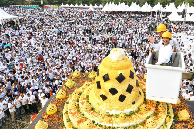 SEMARANG (Pos Sore.com)-Menteri BUMN Rini M Soemarno memotong tumpeng setinggi 4,12 meter yang menjadi simbol perayaan HUT ke21 BUMN yang jatuh pada tanggal 13 April 2019. Perayaan HUT BUMN tersebut dihadiri oleh Pejabat di Kementrian BUMN, Direksi, Komisaris dan ribuan pegawai BUMN yang memadati Marina Convention Centre Semarang, Sabtu (13/4). Melalui sinergi BUMN telah memberikan prestasi untuk negeri dengan kelolaan aset BUMN 2018 lebih dari Rp8.092 Triliun dan laba lebih dari Rp200 Triliun.Bambang TriĀ