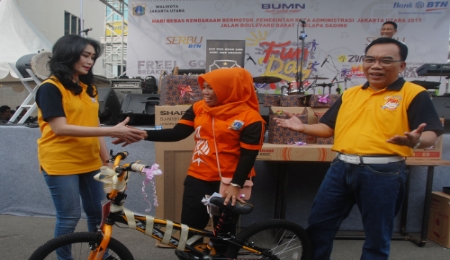JAKARTA (Pos Sore) — Direktur PT Bank Tabungan Negara (Persero) Tbk. Handayani bersama Walikota Jakarta Utara Husein Murad menyerahkan hadiah kepada pengunjung beruntung dalam acara BTN Fun Day di Kelapa Gading Square, Jakarta, Minggu (16/7).