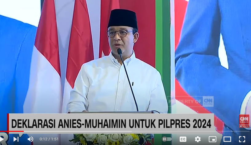 Anies Baswedan pada acara deklarasi Capres – Cawapres bersama Cak Imin di Surabaya//Foto: Tangkapan Layar CNN