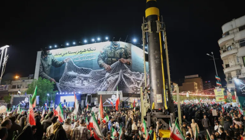 Garda Revolusi Iran (IRGC) memamerkan rudal balistik dalam demonstrasi di pusat kota Teheran pada 21 April./Foto: Istimewa/Alzajeera
