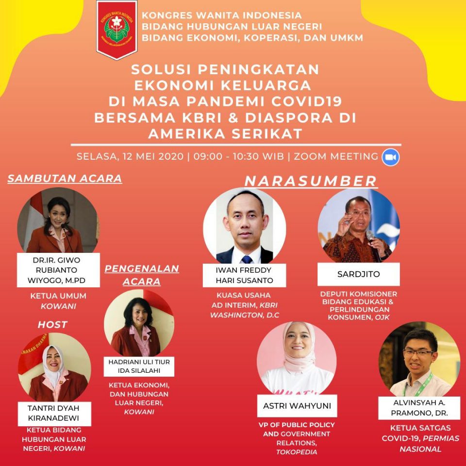 Giwo menyampaikan hal itu saat Webinar Series bertemakan “Solusi Peningkatan Ekonomi Keluarga di Masa Pandemi Covid-19”, Selasa (12/5/2020), yang diadakan Bidang Ekonomi dan Bidang Hubungan Luar Negeri Kowani yang diketuai Tantri Dyah Kiranadewi, bekerja sama dengan KBRI dan Diaspora di Amerika Serikat.