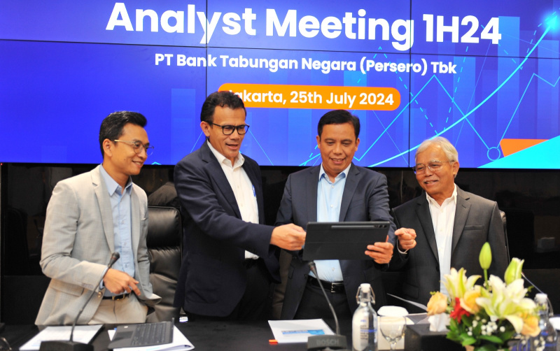 JAKARTA (Possore.id) -Direktur Utama PT Bank Tabungan Negara (Persero) Tbk Nixon LP Napitupulu (kedua kanan), Direktur Risk Management Setiyo Wibowo (kiri), Direktur Finance Nofry Rony Poetra (kedua kiri), dan Direktur Distribution and Institutional Funding Jasmin tersenyum sambil menunjuk laporan keuangan pada acara Analyst Meeting 1H24 di Menara BTN, Jakarta, Kamis (25/7/2024). BTN mencatat penyaluran kredit dan pembiayaan mencapai sekitar Rp352,06 triliun sepanjang semester I/2024. Perolehan tersebut tumbuh 14,4% secara tahunan (yoy) dibandingkan periode yang sama pada tahun lalu sebesar Rp307,66 triliun. B. Tri Prasetyo.