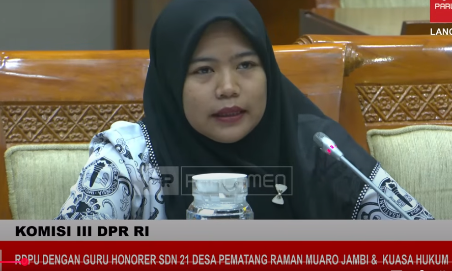 Tri Wulansari, guru honorer di Muaro Jambi yang dikriminalisasi, dijadikan tersangka, saat memberi kesaksian di depan Komisi III DPR, Selasa (20/1-26).//Foto: TV Parlemen