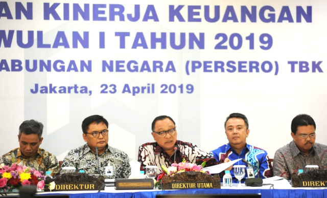JAKARTA (Pos Sore.com) –Direktur Utama PT Bank Tabungan Negara (Persero) Tbk. Maryono (tengah) bersama Jajaran Direksi Bank BTN Iman N. Soeko, dan Oni Febriarto kompak tersenyum di sela Konferensi Pers Paparan Kinerja Bank BTN Per 31 Maret 2019, di Jakarta, Selasa (23/4). Per kuartal I/2019, Bank BTN mencatatkan kenaikan kredit sebesar 19,57% yoy dari Rp202,5 triliun menjadi Rp242,13 triliun. Kenaikan kredit Bank BTN tersebut ditopang oleh kenaikan kuat pada Kredit Pemilikan Rumah (KPR) Subsidi sebesar 28,87% secara tahunan (year-on-year/yoy) menjadi Rp101,99 triliun. Dengan capaian positif tersebut, Bank BTN masih menjadi pemimpin pasar KPR dengan pangsa sebesar 39,35% per Desember 2018. Emiten bersandi saham BBTN ini juga mendominasi pasar KPR Subsidi di Indonesia dengan pangsa sebesar 92,96% per Maret 2019. Bambang Tri