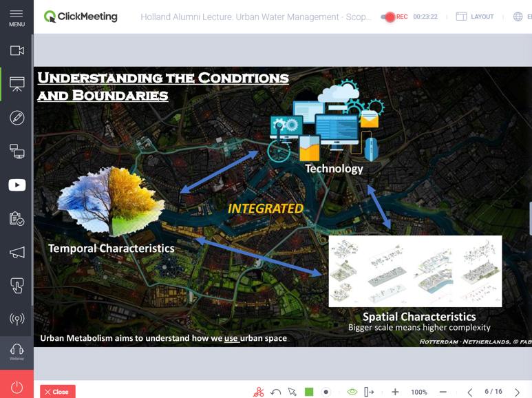 Di awal presentasi, Erbi menjelaskan, banyak kota besar di dunia menghadapi tekanan dan persoalan serius yang diakibatkan oleh pertumbuhan penduduk, perubahan iklim dan kerusakan sistem infrastruktur perkotaan. Berdasarkan persoalan tersebut, seiring dengan pertambahan jumlah penduduk maka permintaan air terus meningkat dan mengharapkan tata kelola air yang efektif dan efisien.