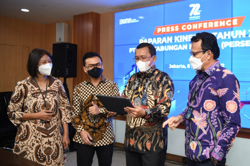 JAKARTA (Possore.com) -Direktur Utama PT Bank Tabungan Negara (Persero) Tbk, Haru Koesmahargyo (kedua dari kanan), Direktur Finance Planning & Treasury, Nofry Rony Poetra (kanan), Direktur Risk Management & Transformation,Setiyo Wibowo (kedua dari kiri), Direktur Wholesale Risk & Asset Management Elisabeth Novie Riswanti (kiri) kompak mengangkat jempol saat pemaparan kinerja perseroan tahun 2021 di Jakarta, Selasa (8/2). Bank BTN membukukan kinerja positif sepanjang tahun 2021, laba bersih melonjak 48,3% menjadi Rp 2,37 triliun. Kenaikan laba ini diiringi penurunan Non Performing Loan Gross dari 4,37% pada tahun 2020 menjadi 3,70% pada tahun 2021. B. Tri Prasetyo