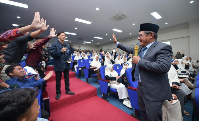POSSORE.ID,JAKARTA-Direktur Utama Bank Syariah Nasional (BSN) Alex Sofjan Noor menyapa para santri usai berfoto bersama dengan Dosen Fakultas Ekonomi Dan Manajemen UNIDA Gontor Royyan Ramdhani Djayusman, Wakil Rektor II Setiawan bin Lahuri, Corporate Secretary BSN Dody Agoeng, Kepala BTN Syariah Solo Toni Ardiansyah saat penyerahan bantuan sosial motor sampah untuk lingkungan pendidikan hijau di sela-sela kuliah umum di Universitas Darusaalam Gontor, Ponorogo, Madiun, Kamis (4/12). Dalam sharing session berjudul Peran Pesantren Dalam Mendukung Transformasi Ekonomi & Perbankan Syariah di Indonesia tercetus gagasan untuk mengajak para santri muda dapat mendukung sosialisasi literasi keuangan syariah di Indonesia dengan pertimbangan pondok pesantren sebagai pusat edukasi dan literasi keuangan syariah, penggerak UMKM syariah, penguat ekonomi halal dan laboratorium syariah. Sebelumnya pada hari yang sama BSN berkunjung ke Pondok Pesantren Gontor dan diterima langsung oleh pimpinan pondok pesantren tersebut KH Hasan Abdullah Sahal.B.Tri Pradetyo