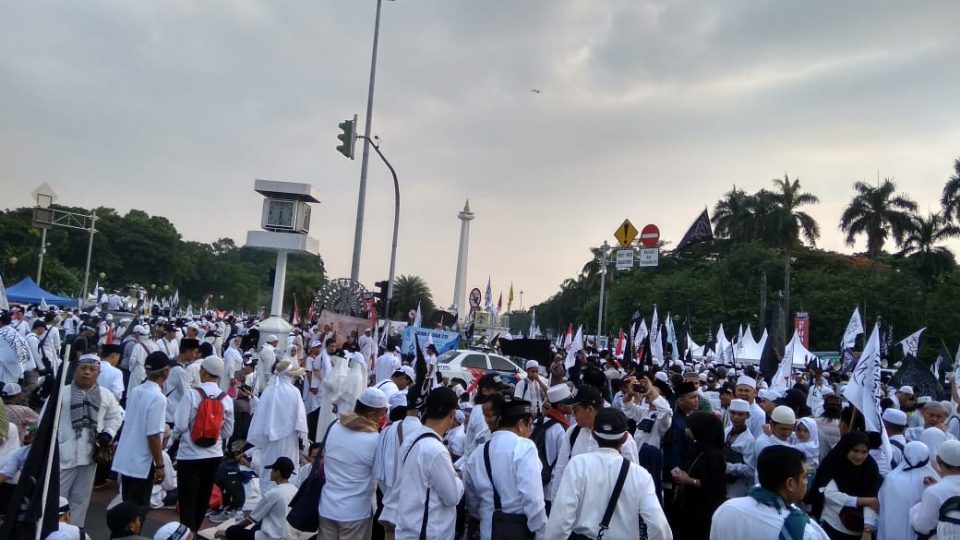 Ribuan, bahkan puluhan ribu — Hbib Rizieq Shihab dari Mekkah menganjurkan sejuta — bendera tauhid berkibar yang dibawa berbagai kelompok massa yang datang dari seantero tanah air, Sementara santunan salawat berkumandang dari berbagai kelompok massa yang hadir, termasuk di kereta commuter line.